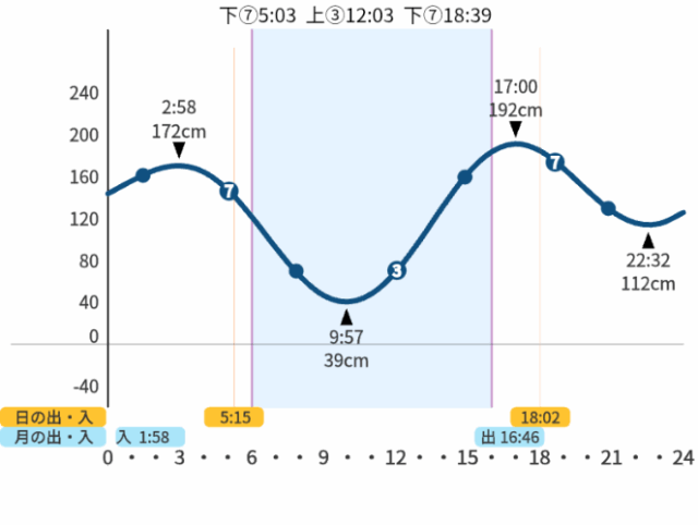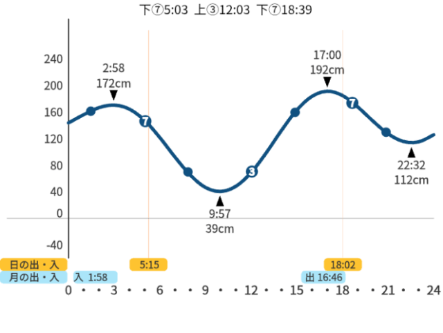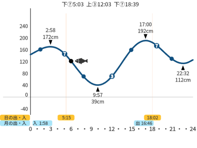 ③や⑦は、釣りの格言「上げ3分、下げ7分」の位置です。その時刻を上段に表示しています。