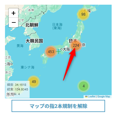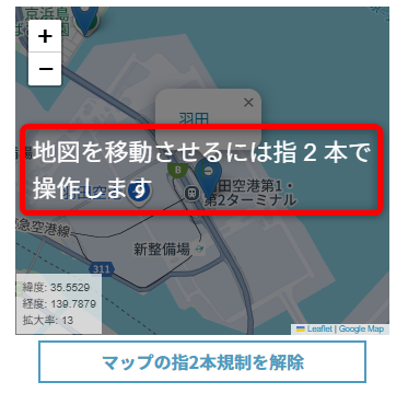 地図の下にある「マップの指2本規制を解除」というボタンを押せば、その指2本規制が解除されるので親指だけで縦横無尽に地図を動かせます。もう一回ボタンを押せば元に戻せます。