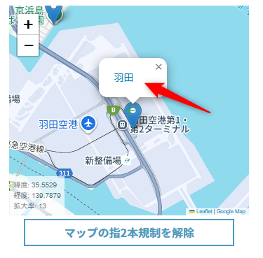 最後は青いマーカーになりますので、羽田にあるマーカーをクリックして、現れる吹き出しの地点名をクリックすれば羽田の地点のページが開かれます。