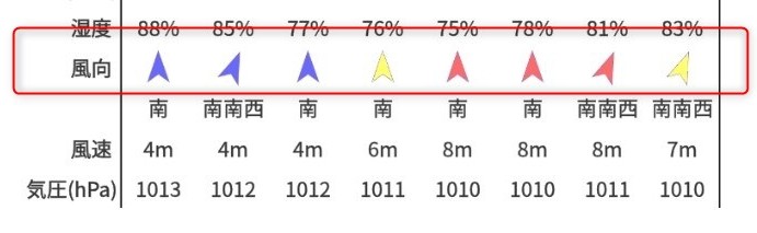 天気エリアについては読んで字のごとくなので、特に説明の必要はないですが、風向きのアイコンは風の強さによって、道路の信号のように青・黄・赤に色分けしています。