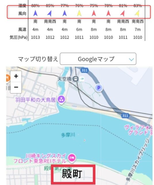 この日に多摩川でオカッパリをするとして、風裏がいいなら殿町側に立ち、爆風の風表がいいなら大鳥居側に立ちます。
