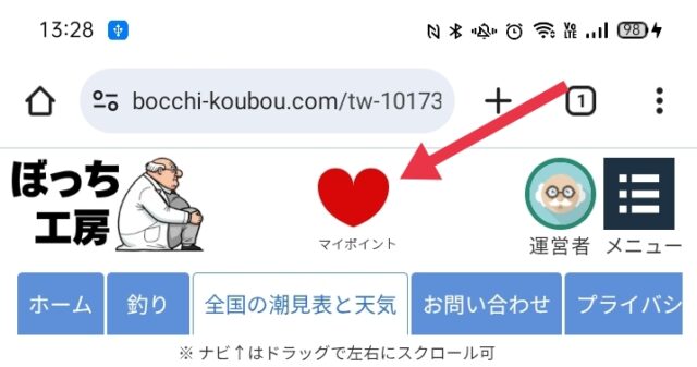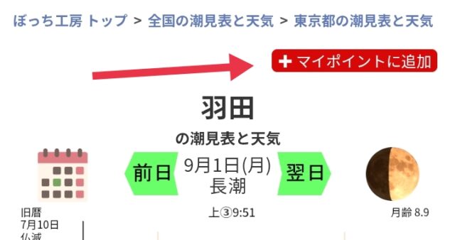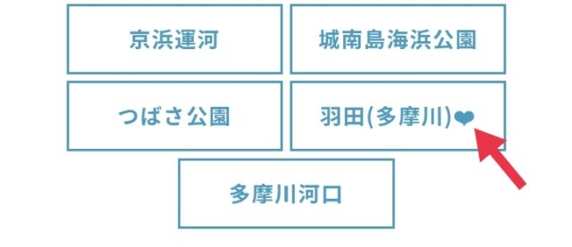 東京都の地点一覧ページの羽田という地点名も羽田(多摩川)のように書き換わり、その横にマイポイントをあらわす❤マークが追加されます。