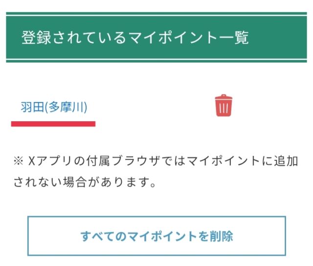 マイポイントから削除したい時は、削除したい地点名の右にある赤いゴミ箱をクリックします。