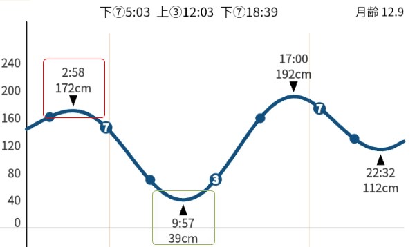 グラフの頂点には満潮と干潮の時刻と潮の高さを表示しています。