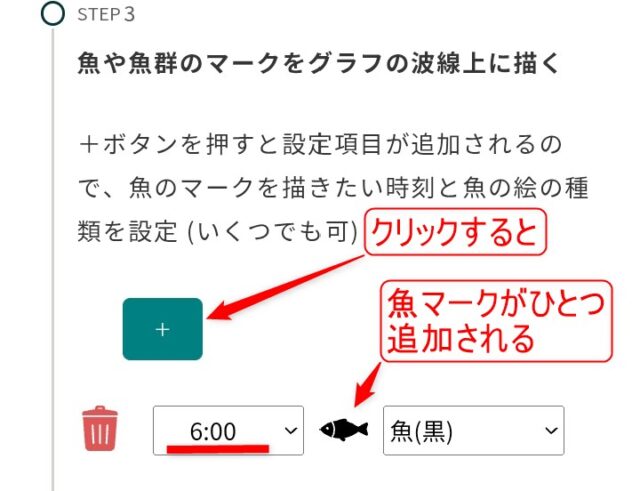 +(プラス)ボタンを押すたびに、グラフエリアに描かれる魚マークは増えます。魚マークを減らしたい時はその行の先頭にある赤いゴミ箱ボタンを押して消します。